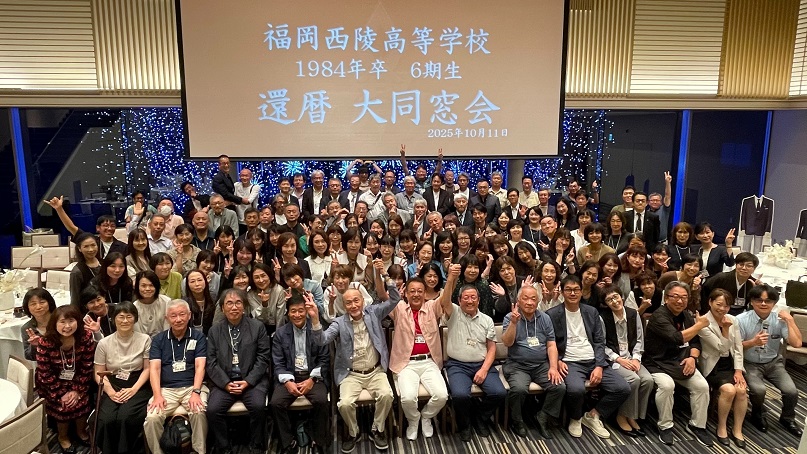 10月11日(土曜日)天神モノリスにて、6期生還暦同窓会を開催しました。6名の恩師の先生方をはじめ、120名の同級生が集まりました。当日は当時の懐かしい映像と音楽🎵、久しぶりに会う友との語らい、恩師との再会。すべてが嬉しく、最高に幸せな時間を過ごすことができました。 じゃんけん大会等大いに盛り上がり、最後は全員で校歌を大合唱しました。またいつか逢えることを楽しみにしています。