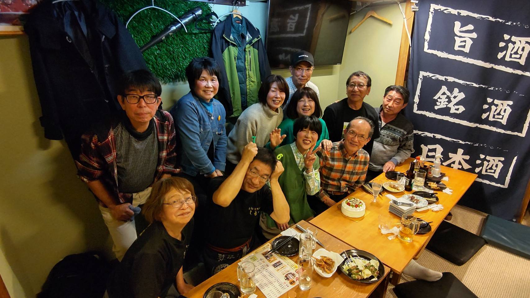 今年も清水先生の76歳のお誕生日会を開くことができました。 先生は背筋もピンとしていて若々しく、62歳になる私達と並ぶと、どこにいらっしゃるか探すくらい、年の差が年々縮まってるような気がします。 会場は「焼鳥しもい」、共に3-10の教室で机を並べた下井夫婦が営むお店です。毎年温かく迎えてくるので、仲間たちと先生と楽しい時間を過ごすことができます。下井くん、きんちゃん、ありがとう!
