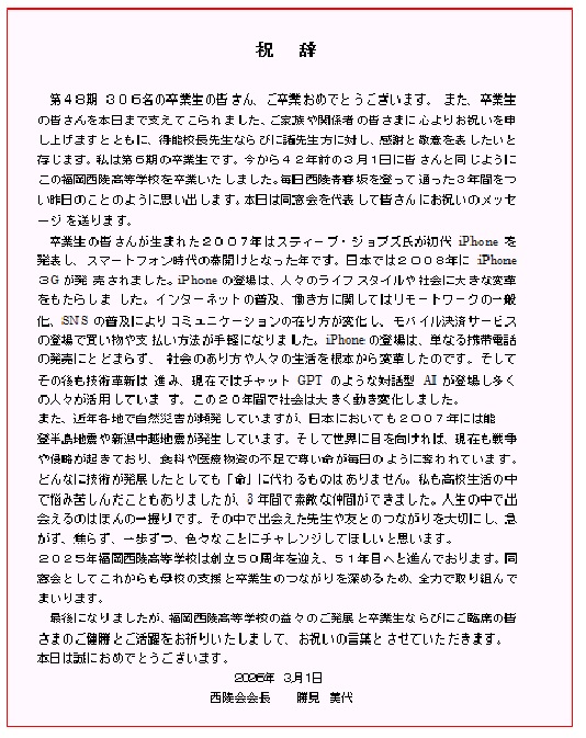 福岡西陵高等学校は今年創立50周年を迎えます。大切な母校のますますの発展と卒業生の親睦と繋がりを深めていくため、西陵会として今後も取り組んでまいります。よろしくお願いいたします。